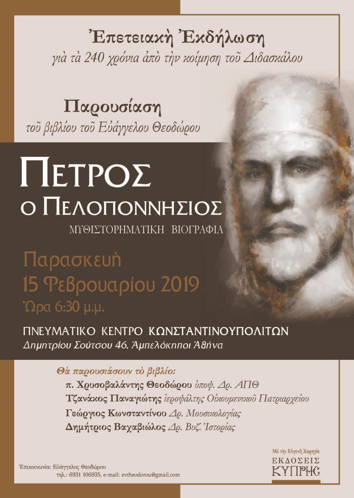 Την Παρασκευή 15 Φεβρουαρίου 2019 και ώρα 6:30 μ.μ. στο πνευματικό κέντρο Κωνσταντινουπολιτών (Δημητρίου Σούτσου 46, Αμπελόκηποι) θα λάβει χώρα η Επετειακή Εκδήλωση για τα 240 χρόνια από την κοίμηση του διδασκάλου Πέτρου Πελοποννησίου με την παρουσίαση του βιβλίου του Ευαγγέλου Θεοδώρου «Πέτρος Πελοποννήσιος»-Μυθιστορηματική βιογραφία.